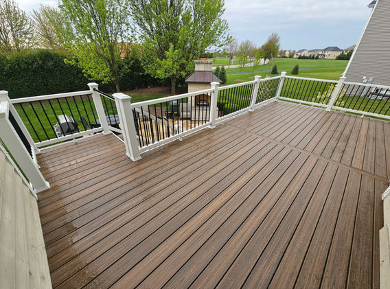 This Trex deck in Plainfield features Trex Enhance decking with Trex Select railing. It was constructed over an existing stamped concrete patio.