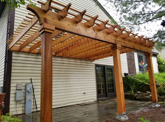 Wood pergola in with privacy wall and matching Unilock columns in Naperville.