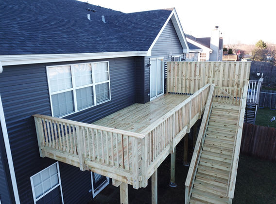 This milti-level wood deck in Batavia features two levels for different entertainment purposes.