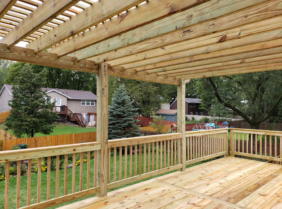 This wood deck in Oswego features a custom built pergola and black aluminum balusters.